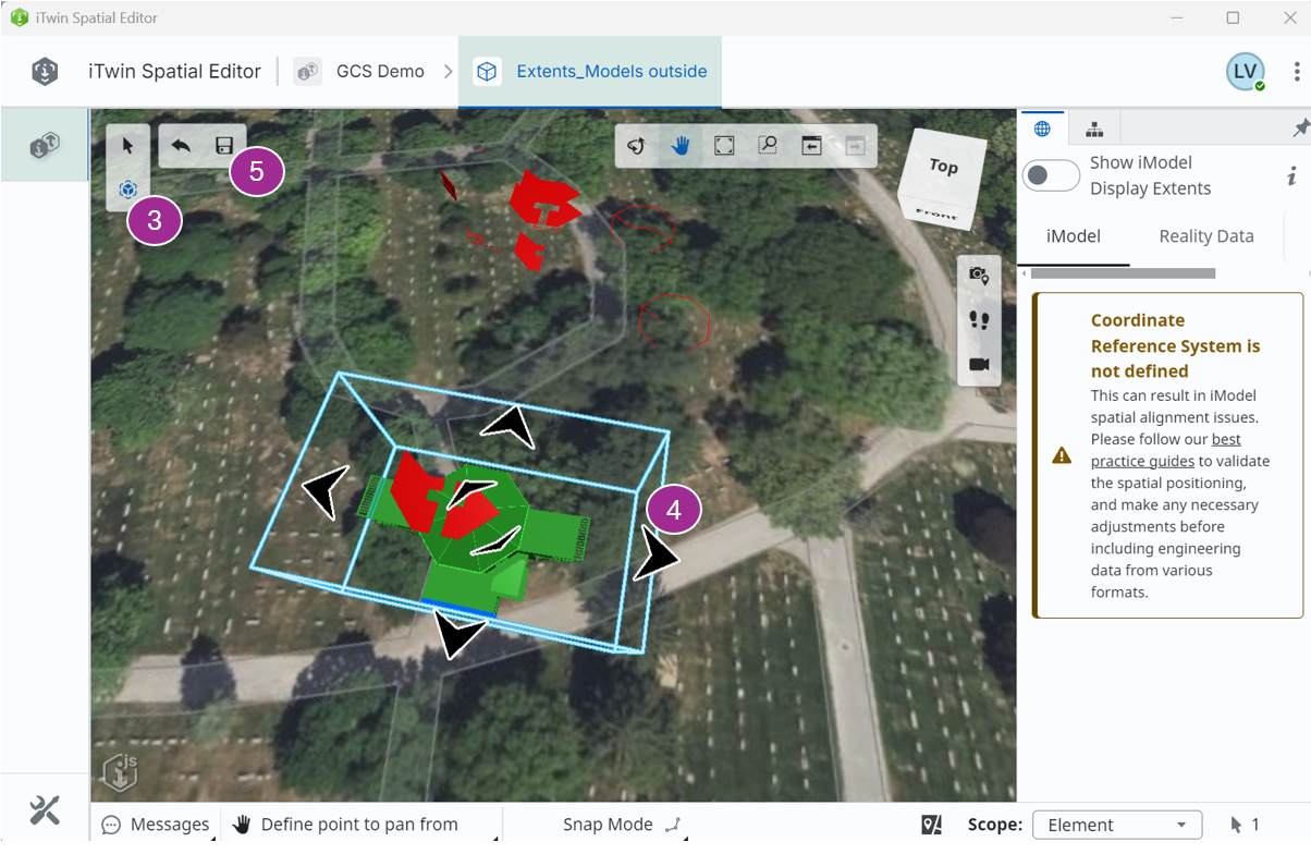 - Click Save (5) to apply your changes. If you cancel the extents editing or close the application without saving, no changes will be made to the iModel.