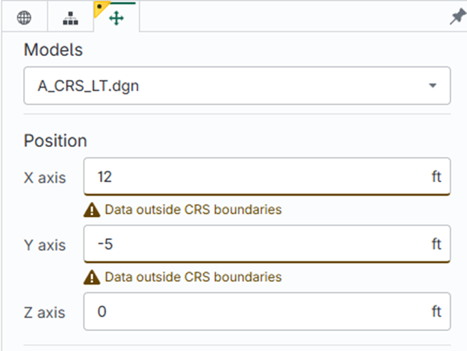 Ensure that model design data is contained within the chosen Coordinate Reference System (CRS) boundaries. Data located outside these boundaries can lead to various technical and practical issues. For example, when geometry is modeled far from the origin, it can result in precision and accuracy problems, as numerical precision decreases. This may lead to inaccuracies in geometry calculations. You might also experience performance issues, such as slower rendering and navigation, among others.