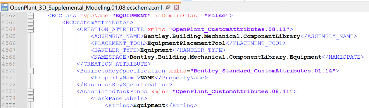 在配置中由于某些操作导致Schema结构异常会造成上述问题,通过比对xml文件,在OpenPlant_3D_Supplemental_Modeling.01.08.ecschema.xml中设备类下发现一行缺失: