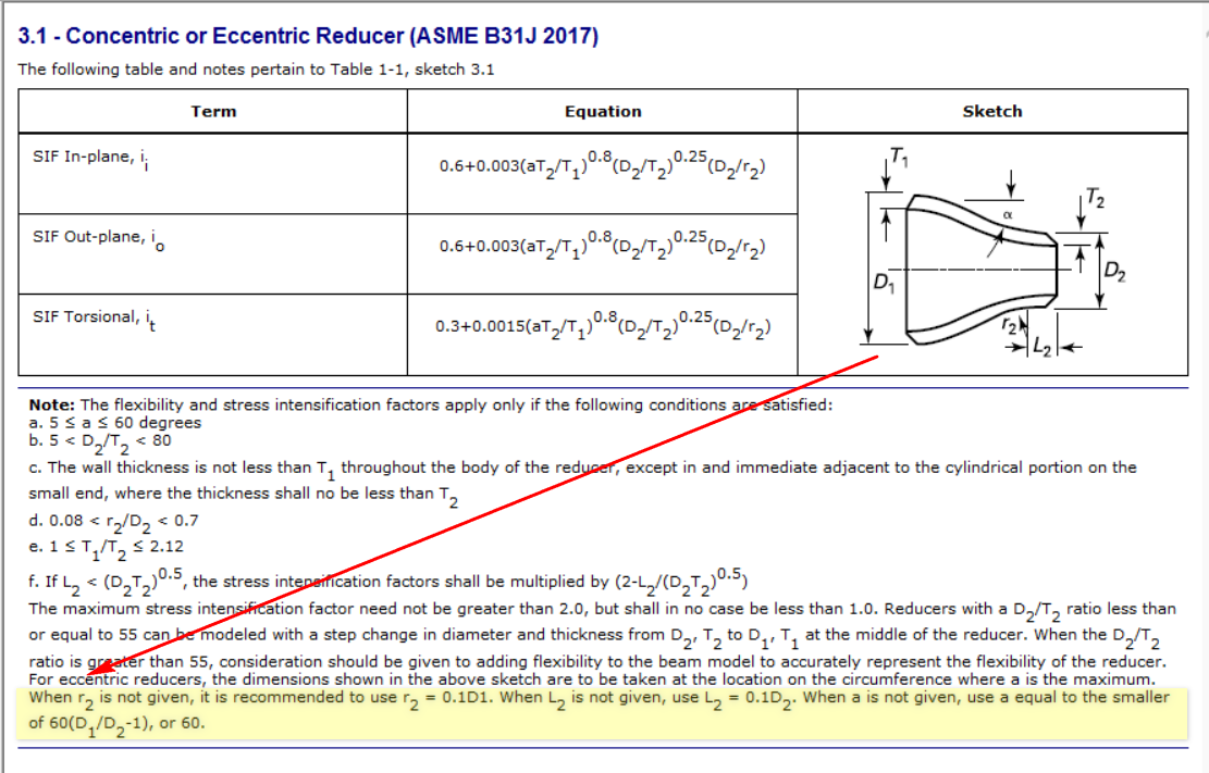在帮助文档中,我们可以查找到ASME B31J对变径的要求,此警告是指ASME B31J对执行SIF计算的比率要求。只有满足以下条件时,柔性系数和应力增大系数才适用于当前模型: