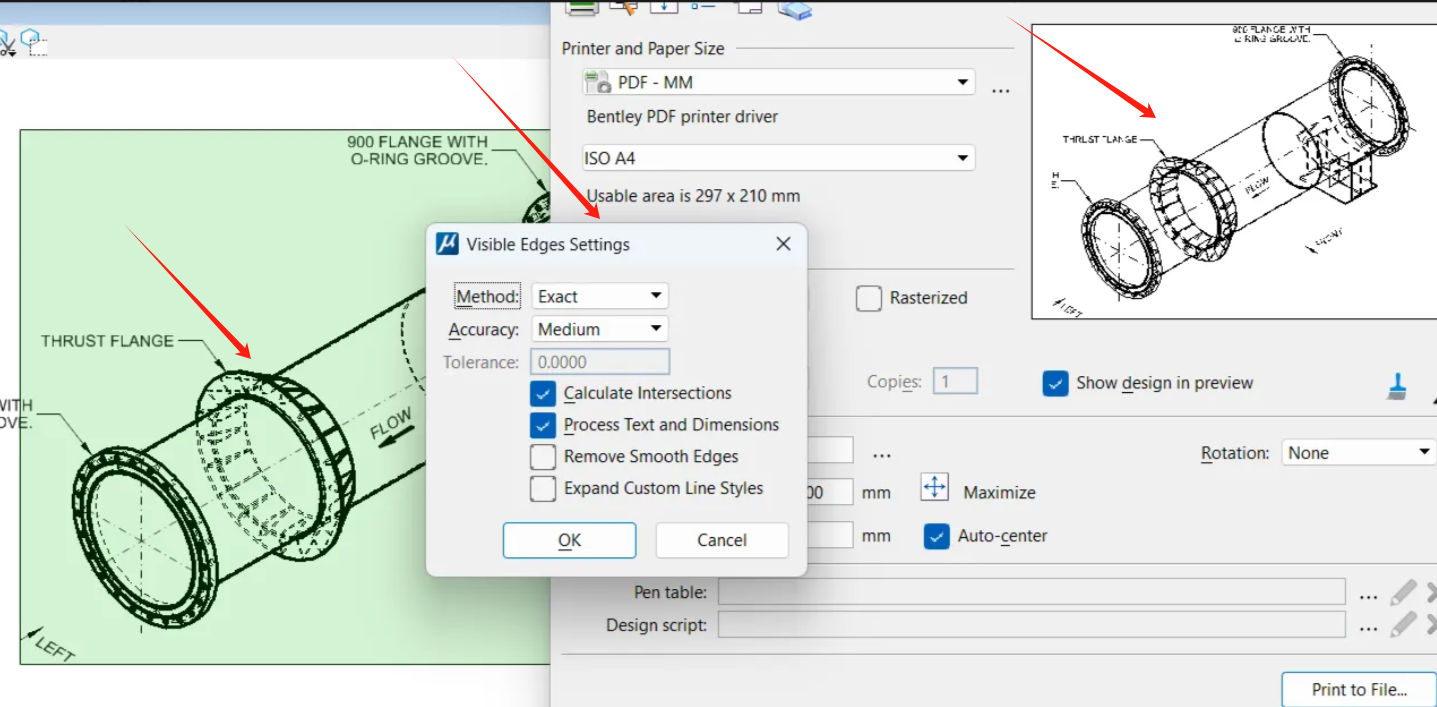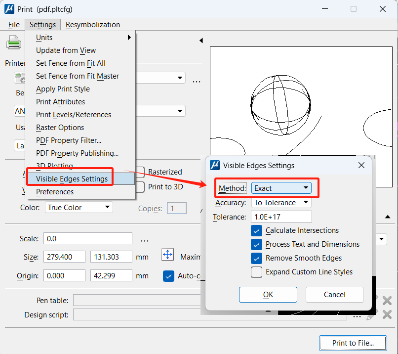 经过调查,发现在打印时,设置如下 Settings菜单中的Visible Edges Settings选项,将Method设置成 Exact(默认值为Fast)就可以解决此问题;即在Exact模式下,是所见即所得的打印: