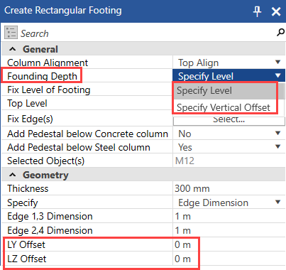 1. 基础深度(Founding depth)——可选择“指定标高(Specify Level)”或“指定垂直偏移(Specify Vertical Offset)”: