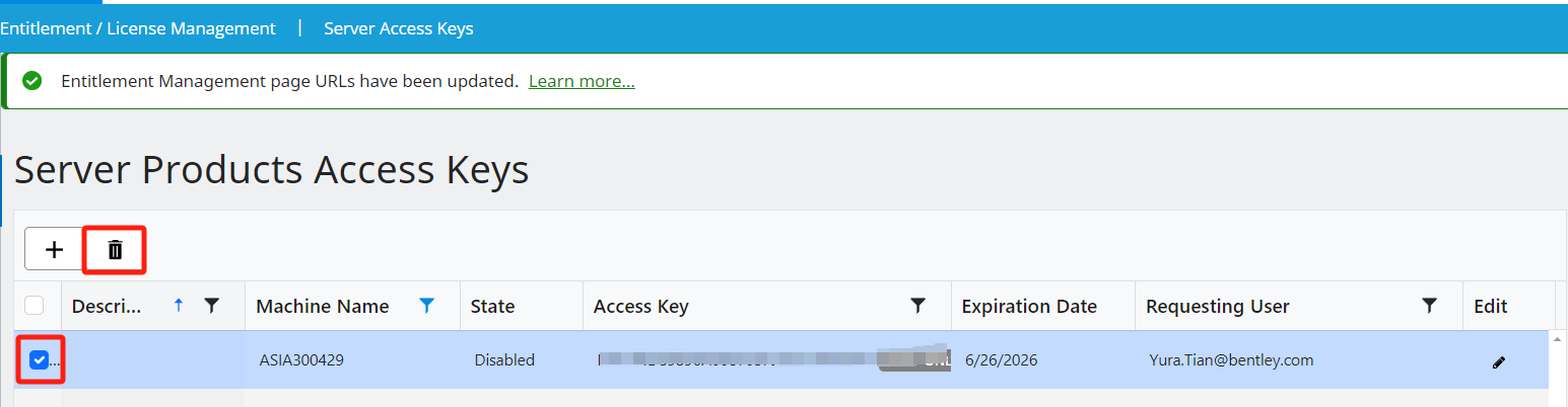 在托管环境或公司内部网络中部署的服务器产品,通常不需要用户一直登录 CONNECTION Client 软件。为了让这些服务器产品能安全地获取授权,我们使用一种特殊的“访问密钥”。当您在服务器上安装产品时,系统会为该机器生成一个唯一的访问密钥。这个密钥就像一个安全、长期有效的令牌,授权服务(Licensing service)可以用它来向订阅授权服务(Subscription Entitlement Services)申请权限。管理员或共同管理员可以管理这些密钥。