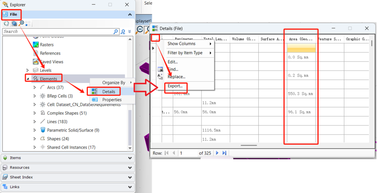 打开Explorer对话框后,在第一个卡片File下,依次展开:文件名字> Model> Model名字> Elements,鼠标右键点击Elements,在弹出菜单中点击 Detail,然后会打开一个元素详细信息的窗口,这个列表中有Area这一列,如果一个元素带有Area表面积属性,就会列出表面积的值;然后鼠标右键点击左上角第一个cell,打开的弹出菜单中有Export菜单,点击后会将当前列表中的所有信息导入到一个外部的Excel中;
