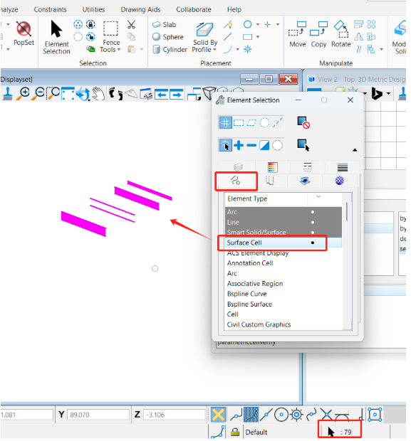 1. 使用元素选择工具,在Element Type卡片下选择Surface Cell,有79个元素被选中: