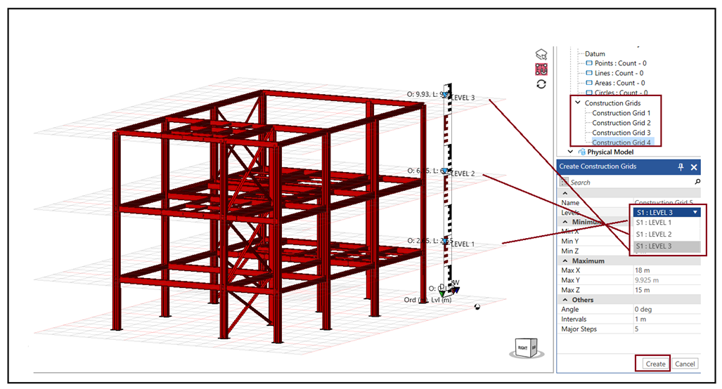 点击 “工具”->“几何工具”->“创建网格”->“按标高创建网格”,会弹出 “创建构造网格” 页面,并带有多个标高的选项。点击下拉箭头展开 “标高”,所有可用标高都会显示出来。在下图中,我们可以看到一个上部结构,其在地面标高之上还有三个标高,因此现在有三个新标高可用。点击选择每个标高,输入 X 和 Z 范围,然后点击 “创建” 按钮在该标高生成另一个网格。下图中利用这三个标高生成了三个额外的网格。