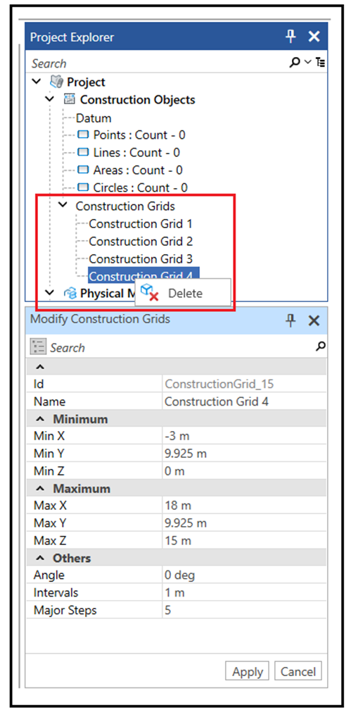 在 “项目浏览器” 页面,所有可用网格都显示在 “项目”->“构造对象”->“构造网格” 下。用户可以选择任何网格,右键点击并选择 “删除” 来删除该网格。当选中任何网格时,会弹出 “修改构造网格” 页面,在该页面可以进行任何必要的修改。