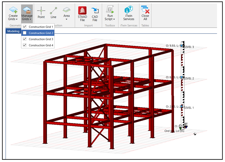在下图中,有四个可用网格 —— 构造网格 1、2、3 和 4。这里,一层标高的网格 2 被停用,因此在模型中不显示。