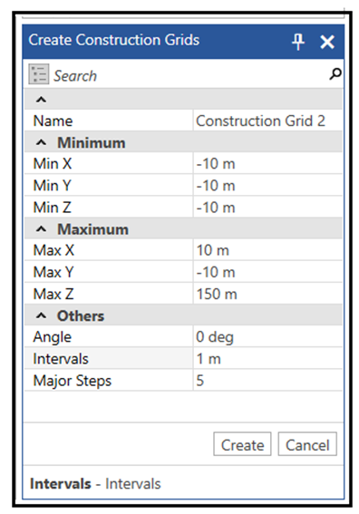 点击 “工具”->“几何工具”->“创建网格”->“创建网格”,会弹出一个名为 “创建构造网格” 的页面。输入 X、Y、Z 的最小和最大范围。如果需要,可以输入一个新名称。点击 “创建” 按钮生成新的网格系统。它还提供了生成一定角度的网格系统的选项。下图显示了在 Y=-10m 标高生成一个额外网格系统的输入,X范围为 -10m 至 10m,Z范围为 -10m 至10m。这将在 -10m 标高创建一个额外的网格。我们之前在 Y=0m 标高有一个网格,因此两个网格会如下图所示。通过这种方式,使用该工具可以在不同标高或同一标高生成多个网格。