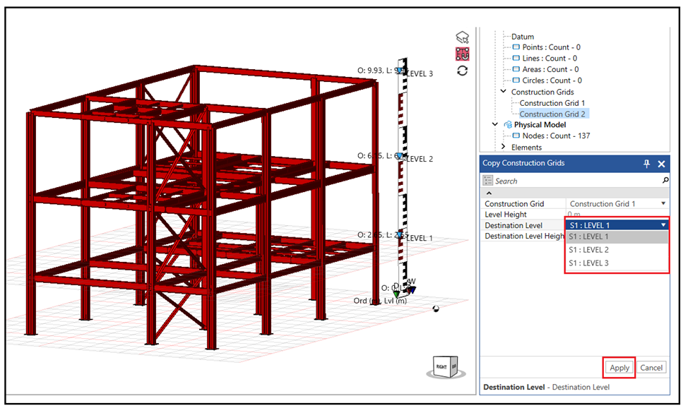 这是一种便捷地将一个网格从一个标高复制到另一个标高的选项。与上一个选项类似,它也仅当不同标高存在对象时才可用。点击 “工具”->“几何工具”->“创建网格”->“复制网格”,会弹出 “复制构造网格” 页面。从 “构造网格” 下拉菜单中选择要复制的网格,通过点击 “目标标高” 下拉菜单并选择正确的标高,来确定要生成新网格的标高,点击 “应用” 按钮执行操作。在下图中,构造网格 1 被复制到目标标高 1,在一层标高生成了一个新的网格(构造网格 2)。