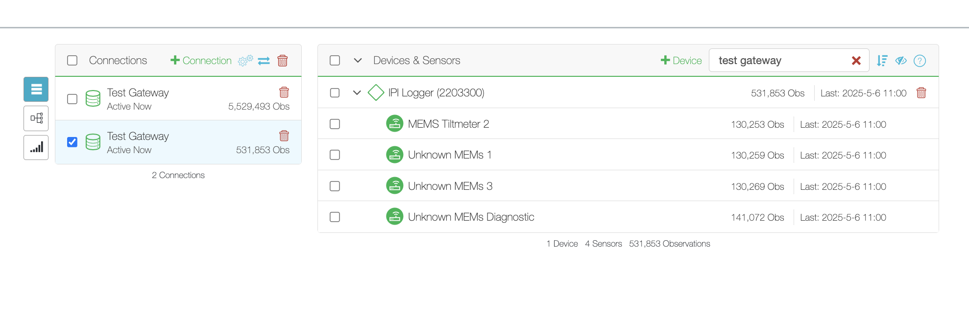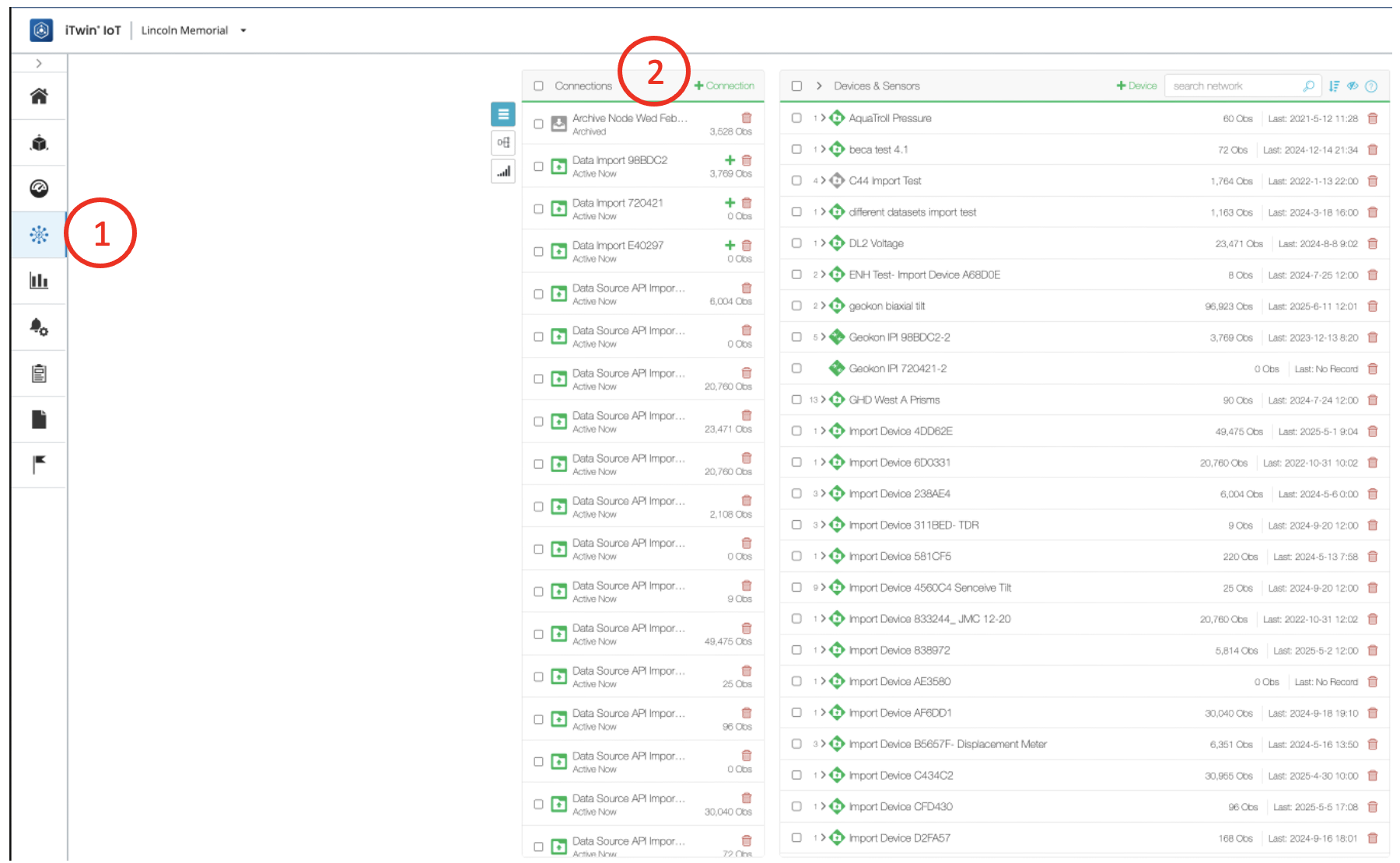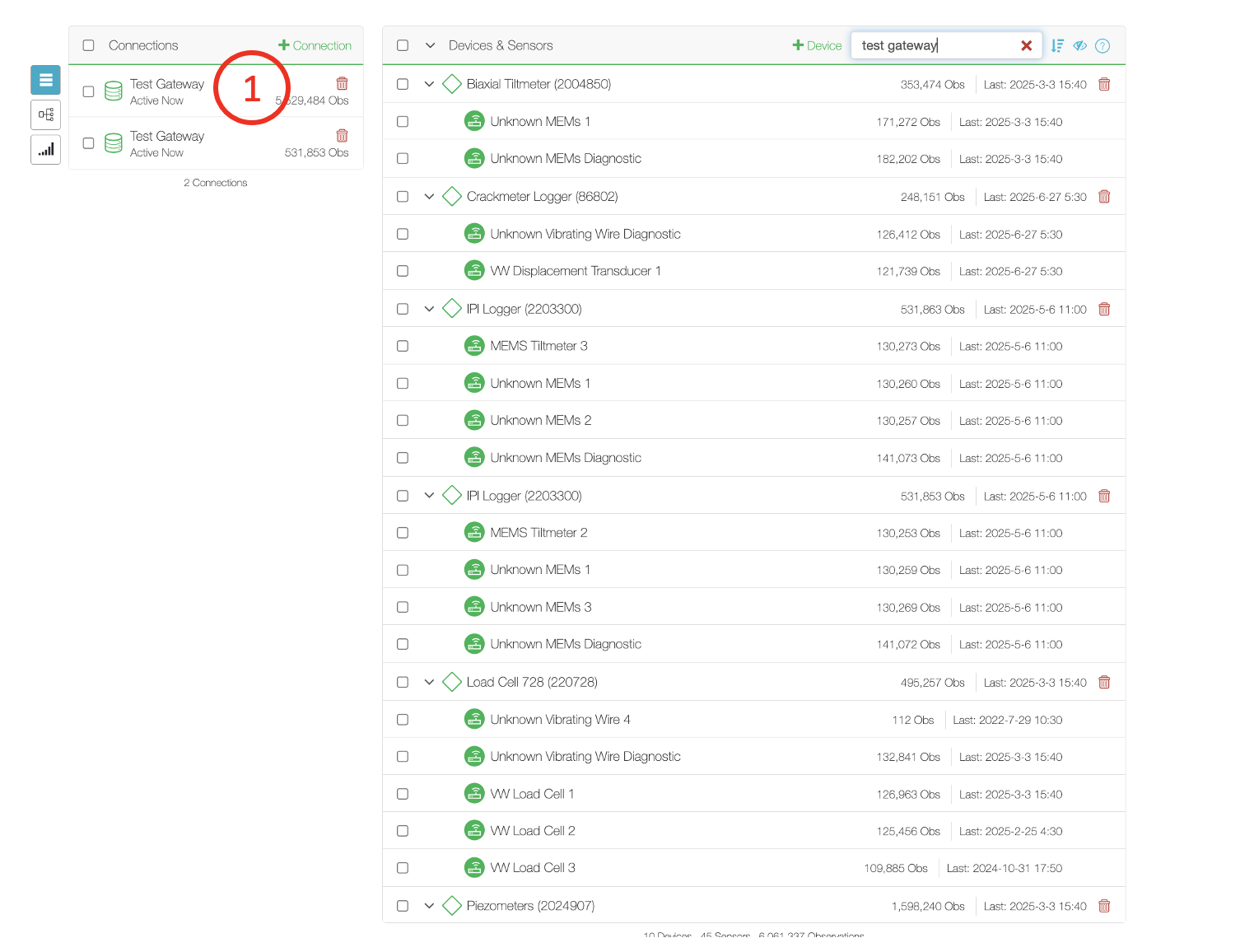1. From the Connectivity page, click on the Geokon device node connection on the left side of the page.