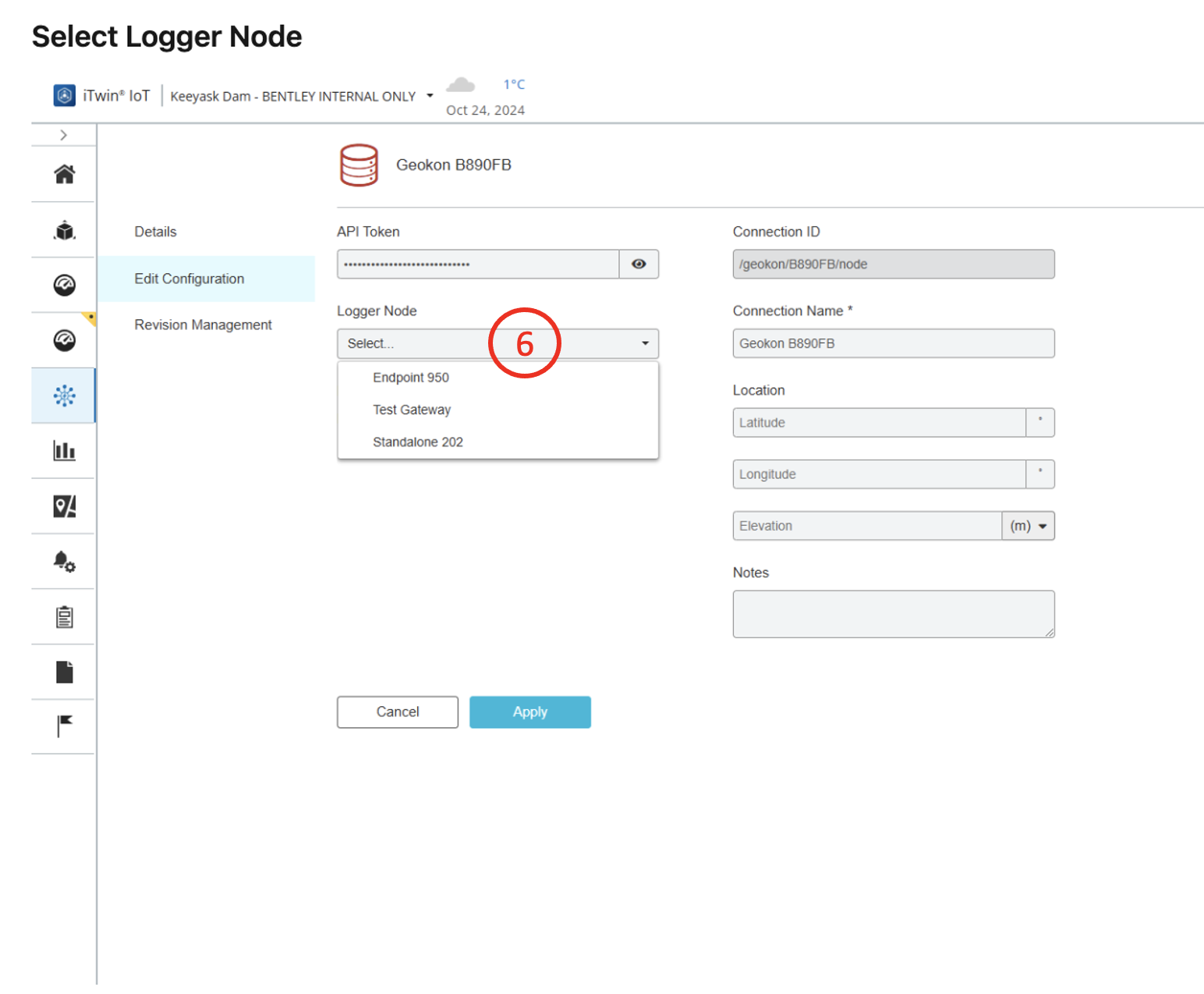 The Geokon Agent API connection allows users to bring data from their logger nodes and vibrating wire sensors in Geokon Agent into the iTwin IoT software for visualization. This article will guide you in establishing the connection between the Geokon software and iTwin IoT and enabling logger nodes within iTwin IoT to pull data into the selected project.
