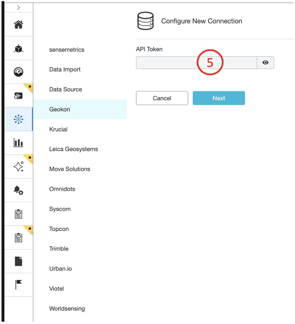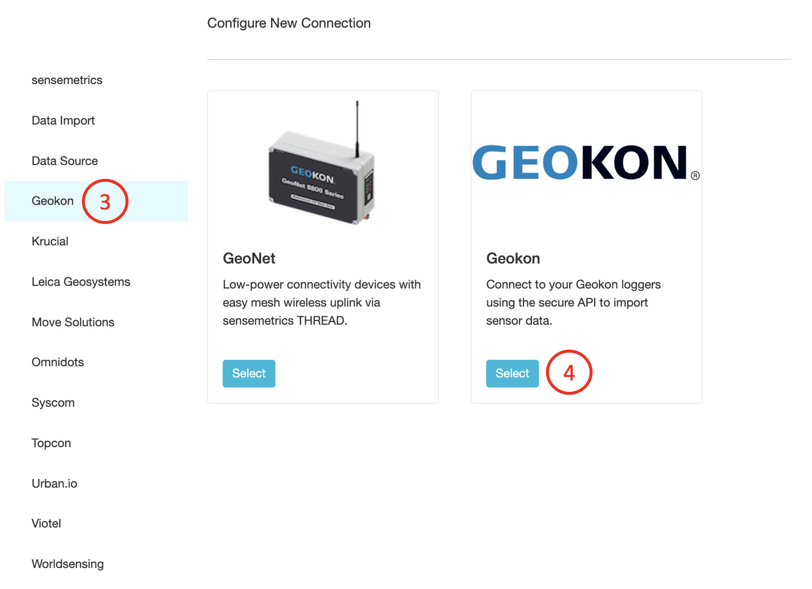 3. On the Configure New Connection page, select Geokon from the left sidebar.
