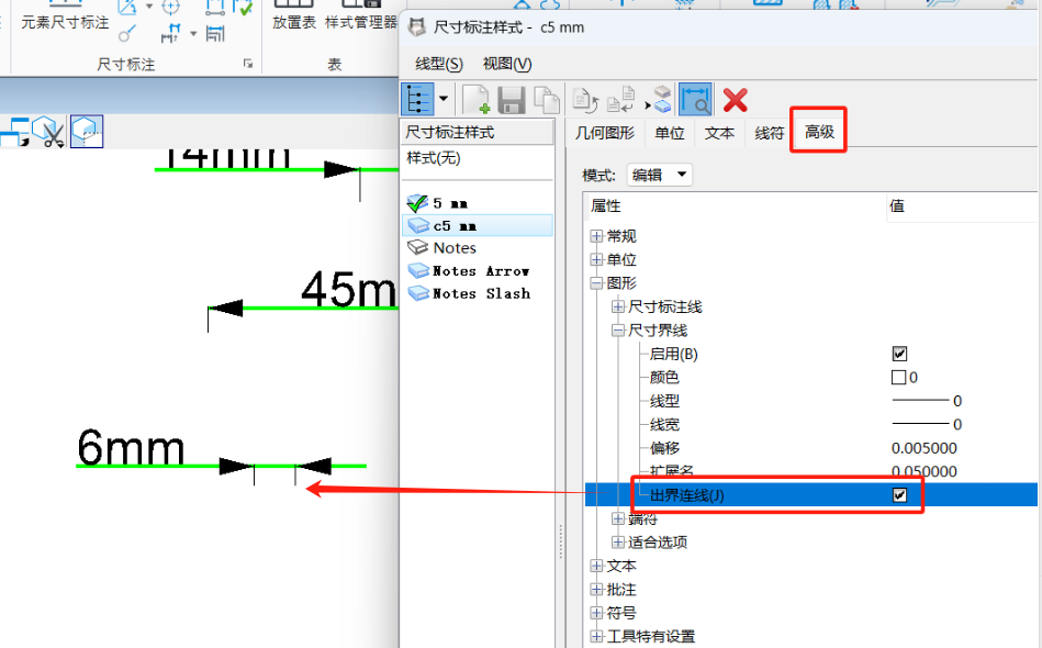 高级> 图形> 尺寸界限> 出界连线 勾选上,标注中间的连通线就会出现了:
