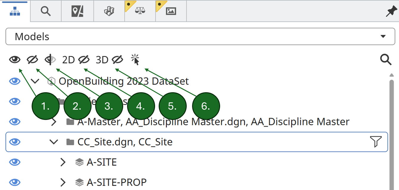 These controls are typically found in the Tree Widget toolbar or context menu. They help you manage what’s visible in the 3D or 2D view.