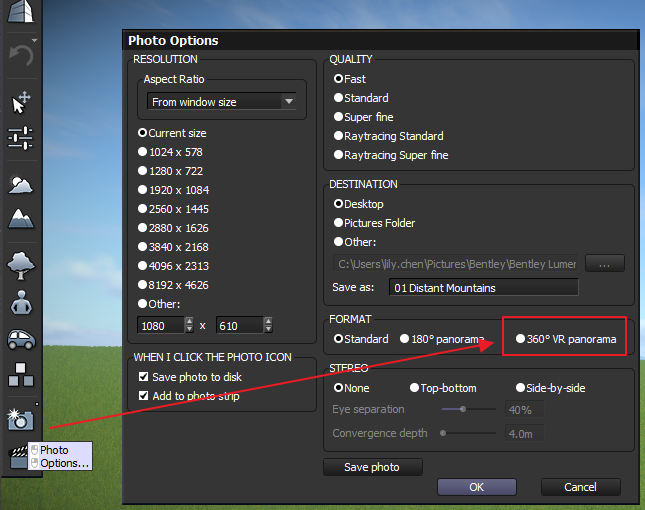 LumenRT软件中,快捷键F6可以实现正常的拍照功能,(也就是左键点击菜单中的相机选项)。 如果右键相机图标,可以调整相机的设置,如下图所示。