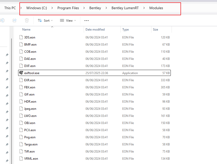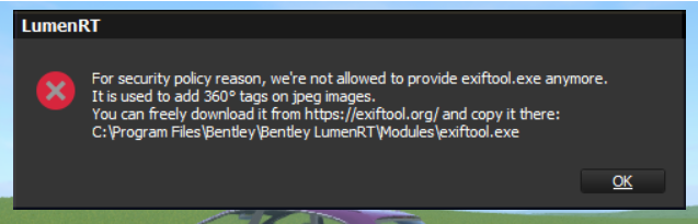 用户需要手动下载该工具,并把它放到下面路径:C:\Program Files\Bentley\Bentley LumenRT\Modules\exiftool.exe
