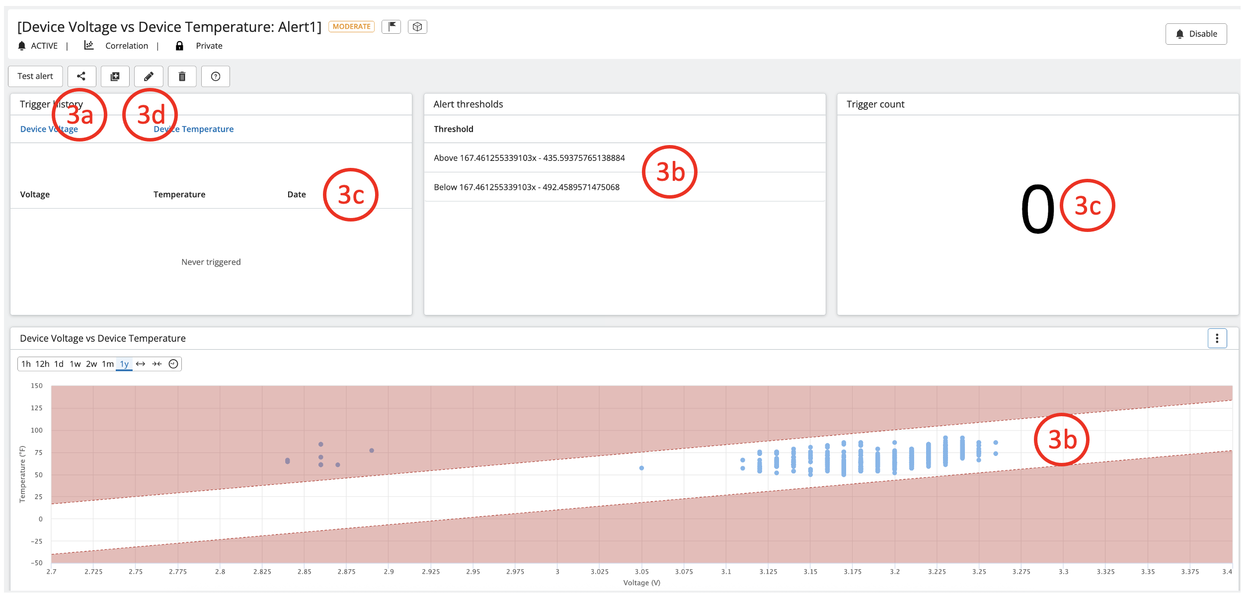 3b. Alert Threshold Formula and Graphs- The alert thresholds are provided as an equation via the alert thresholds card in the middle of the page, or you can visualize the thresholds via the graph at the bottom of the page. The red shaded areas represent the alert threshold boundaries.