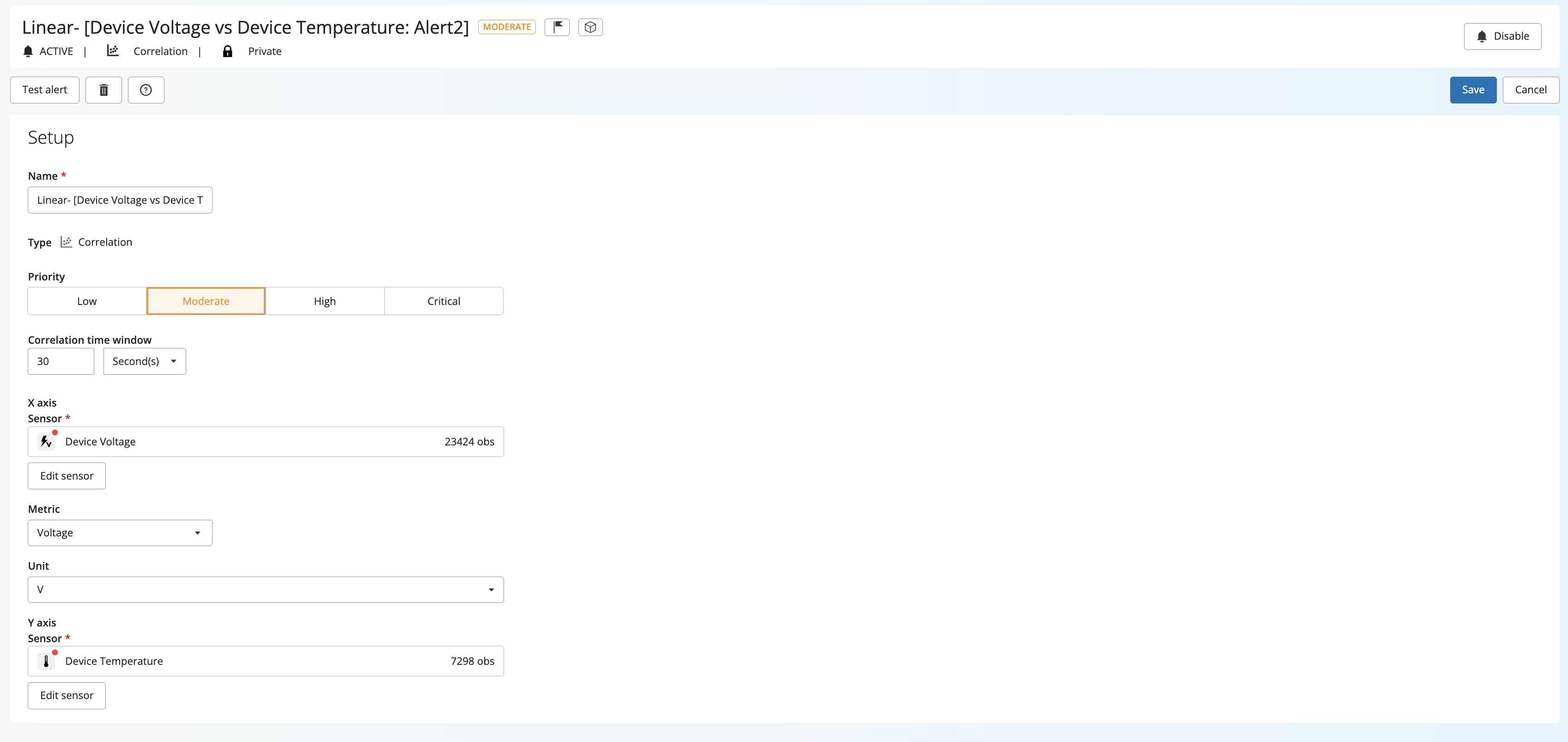 3d. Alert Edit- Clicking the "Edit" pencil icon takes you to the Alert configuration window below, where you can adjust sensors, alert thresholds, and other elements of the alert.