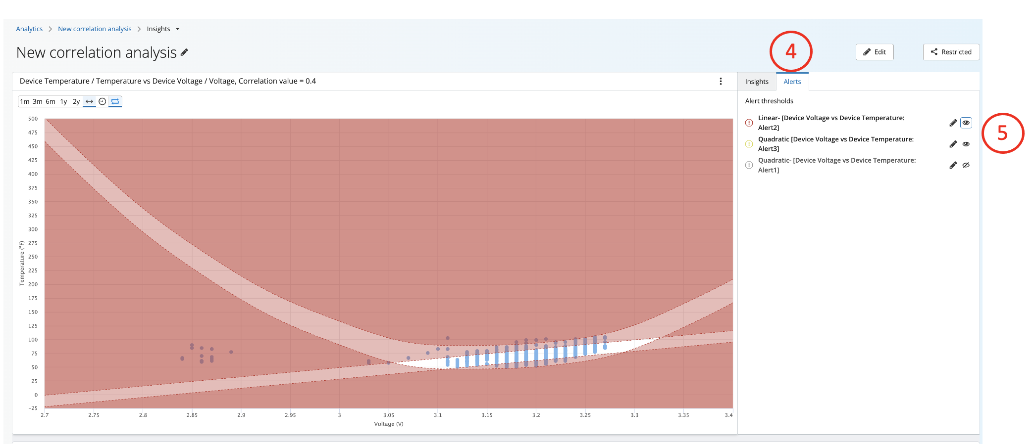 5. Turning on Alerts- If there are alerts configured for the sensor pair, they will show up in the Alerts list. To toggle them on, click the eyeball icon next to the alerts you want to visualize. The example image below shows linear and quadratic equation alerts simultaneously turned on.