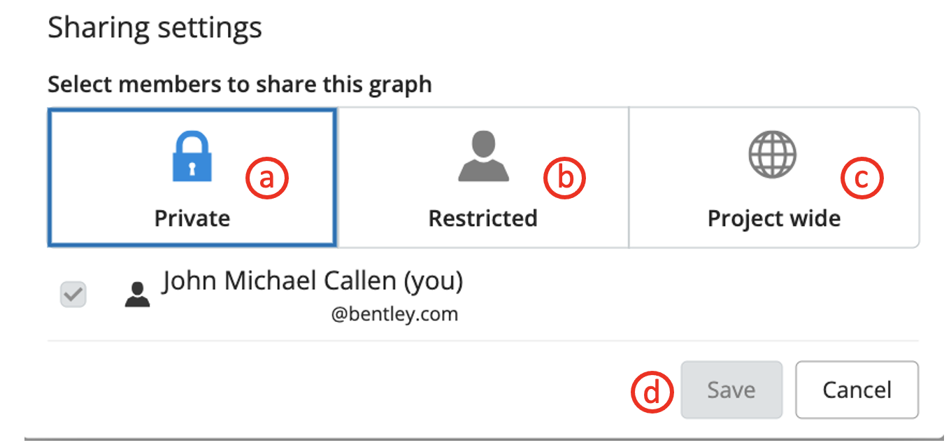 3a. Sharing Alert- Clicking the share button in the upper toolbar opens the sharing settings window shown below. The three options will be explained below.