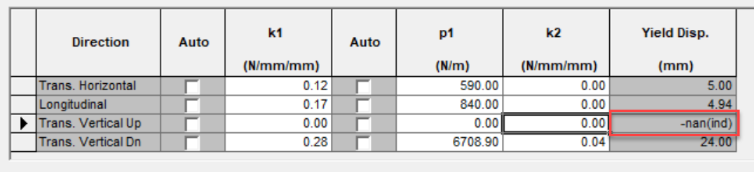 There is a known modeling technique for representing the absence of soil in a particular direction, indicating that neither K1 nor P1 values should be set to Zero. It is preferable to input a minuscule value to be effectively Zero (e.g., K1 and P1 = 0.001).