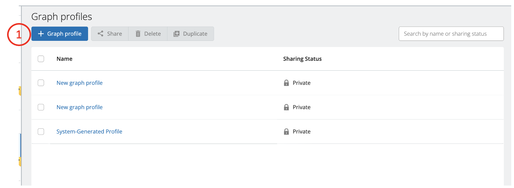 After completing the steps above, you will be on the Graph profiles page, as shown below. This page allows you to not only create new graph profiles but also view all the profiles created by or shared with you.