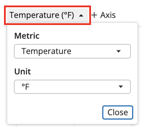 Once a sensor or multiple sensors have been selected in the step above, the screen will change to a preconfigured graph of the sensor or sensors with a default metric and metric unit selected. The graph example below is a temperature sensor graph with the default metric of Temperature displayed in degrees Fahrenheit.