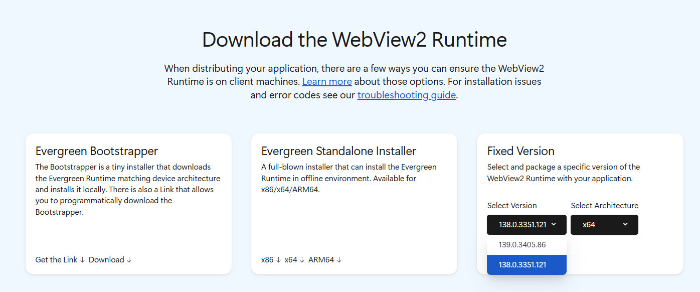 1. 从微软的官方链接中去下载WebView2 138.0.3351.121 (需从下拉菜单中选择这个版本)。