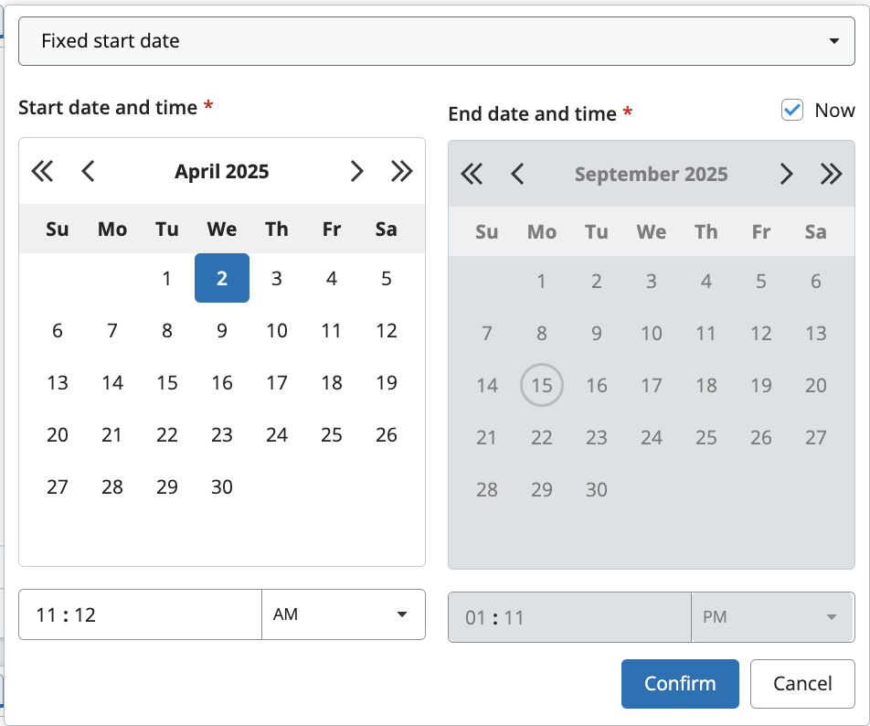Custom Selection- Clicking the clock icon opens a configuration window, shown below. The dropdown at the top of this window allows you to select between "Fixed start date" and "Rolling Time Range". These two configuration options will be explained below.
