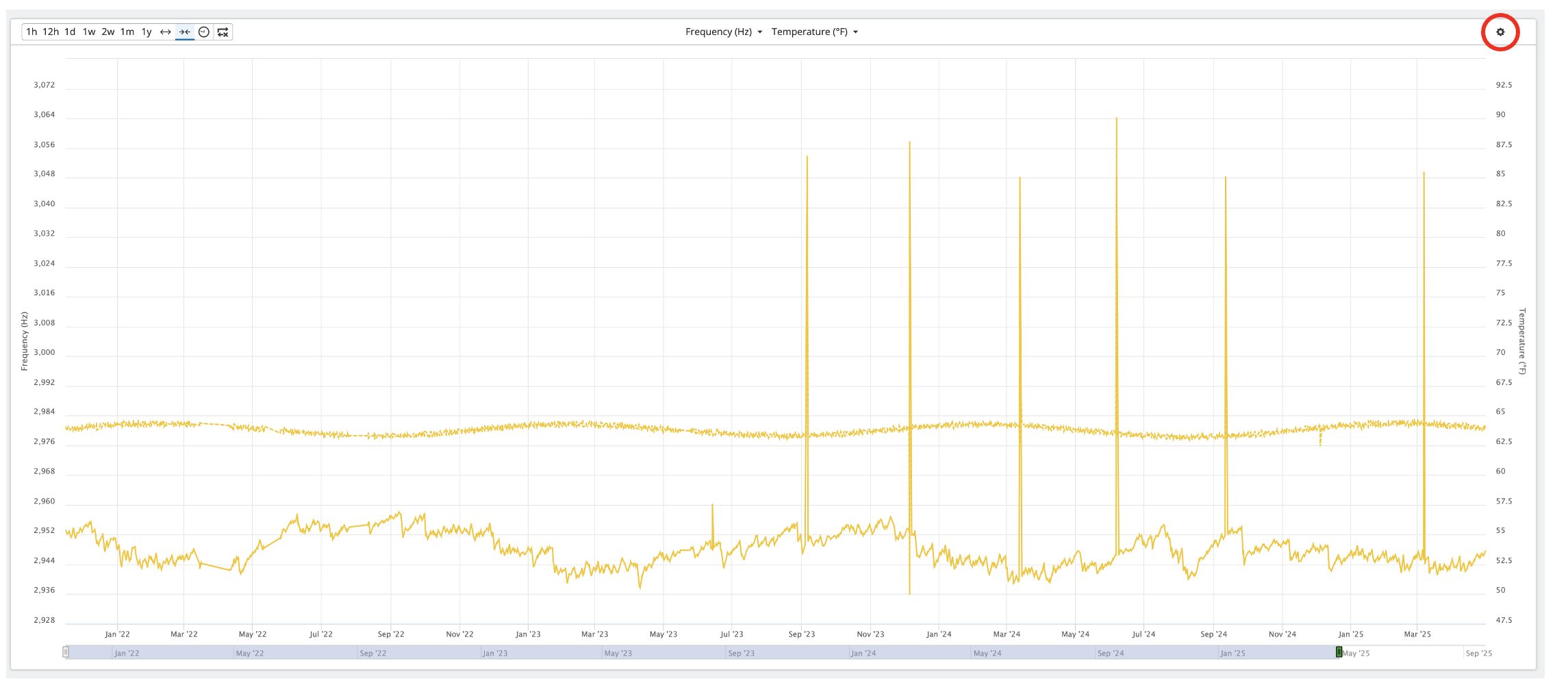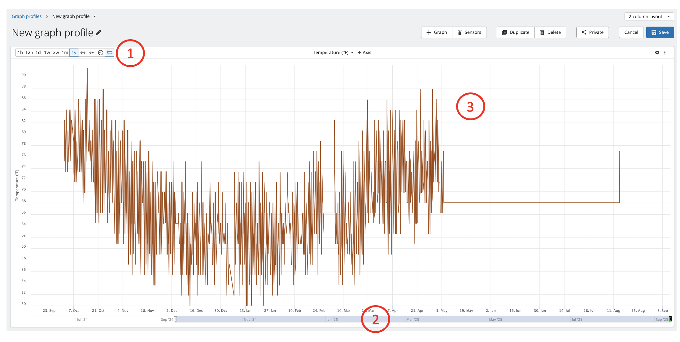2. Time-slider Timeframe Selection- Below the X-axis time legend for the graph, there is an additional time bar (red rectangle) that ranges from the first datapoint of the sensors on the graph to the current time, and a slider bar (red oval) is visible on that time bar to visualize the timeframe of the data displayed on the graph. This time-slider can also be grabbed on either end to change the time range of the graph, or it can be clicked and dragged to change the graph time range.