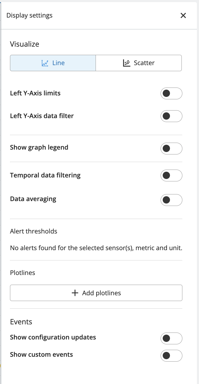 The Display Settings window allows a large number of visualization customizations for a graph. This section will show you all of the configuration options in the Display settings window. These options will apply to only the graph pane selected.