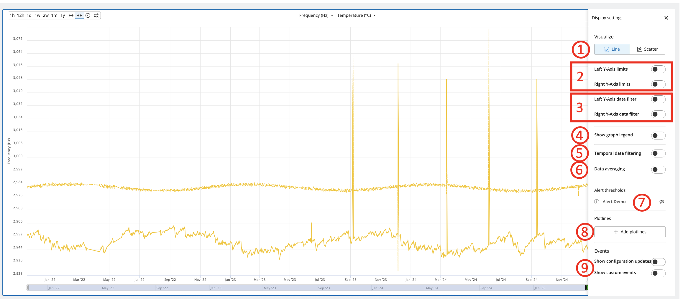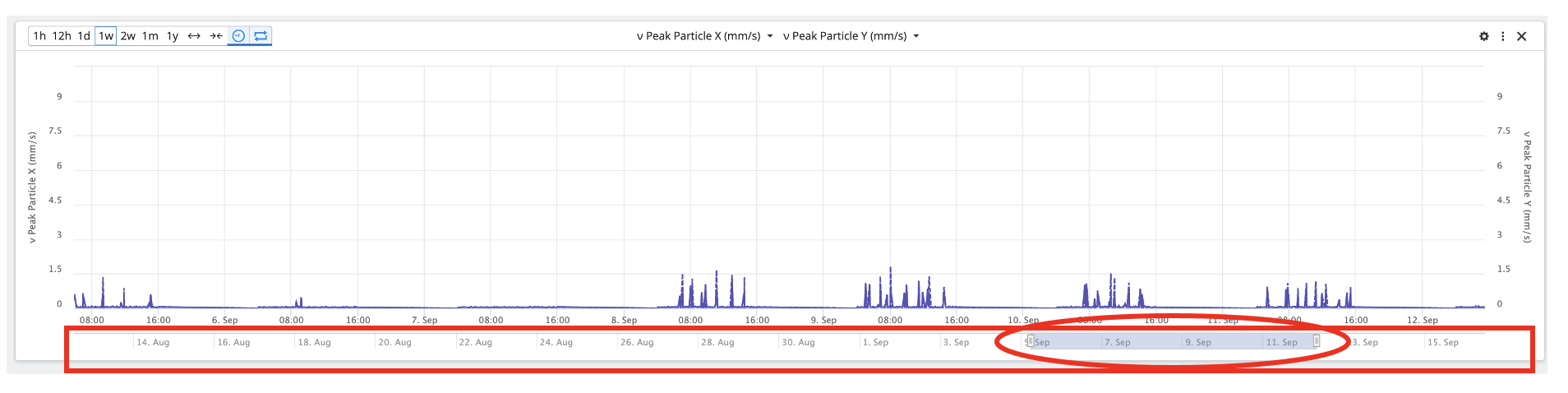 We will go through the several options available to you to change the time window display of the X-axis: 1. Timepicker, 2. Time-slider, and 3. Click and Drag Zoom.