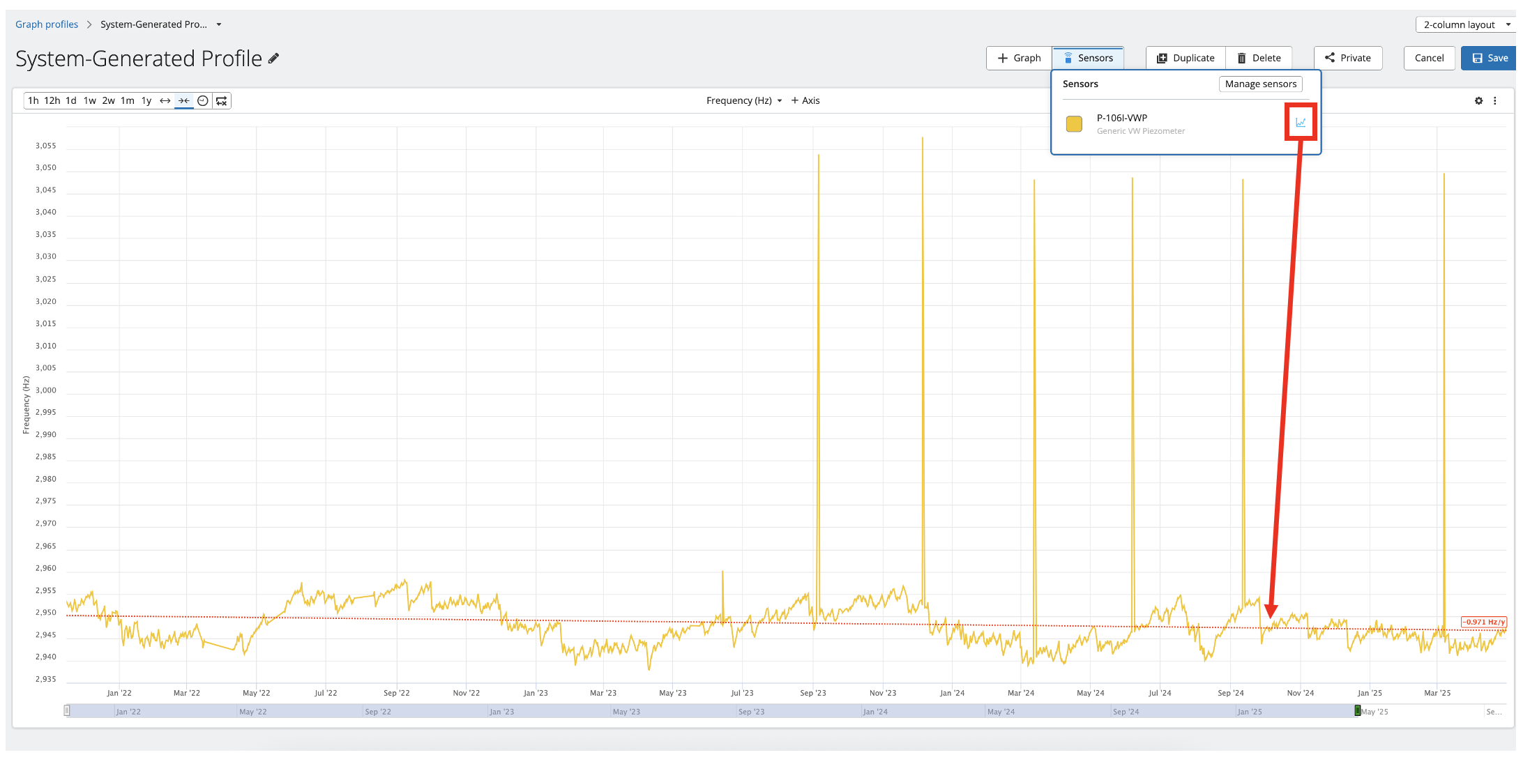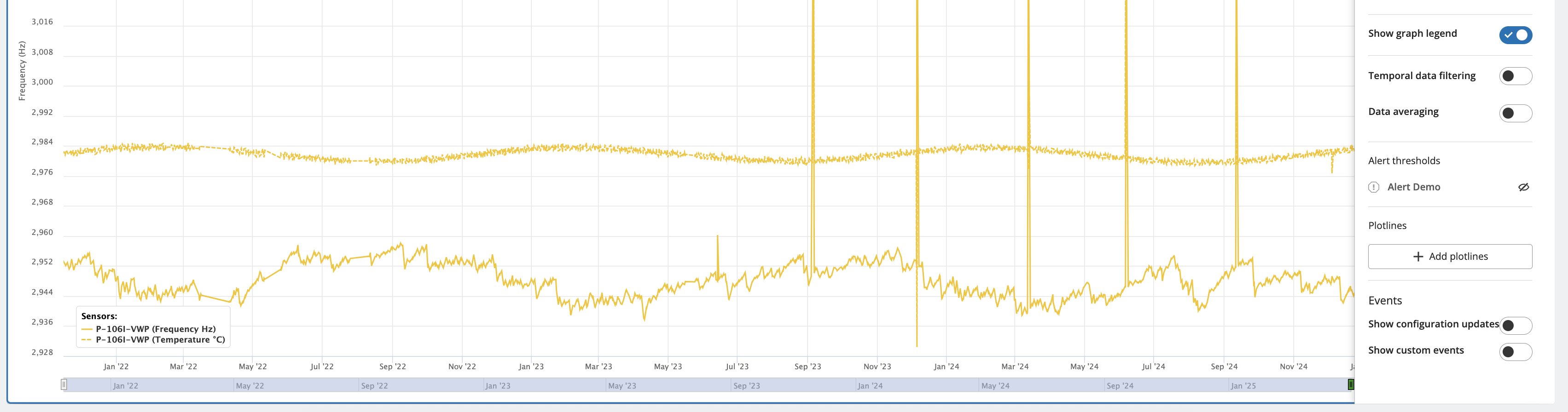 9. Events- Events are broken down into two categories: configuration updates and custom events. These events are created in the sensor configuration window. Configuration updates are logged any time the sensor configuration is changed (ie VW zero values), and Custom Events (notes about sensor issues, weather, etc.) can be manually input. They are tied to a timestamp. These events can then be toggled on to show up as vertical lines on the graph. The example below shows a bad sensor reading event on the last anomalous frequency reading.
