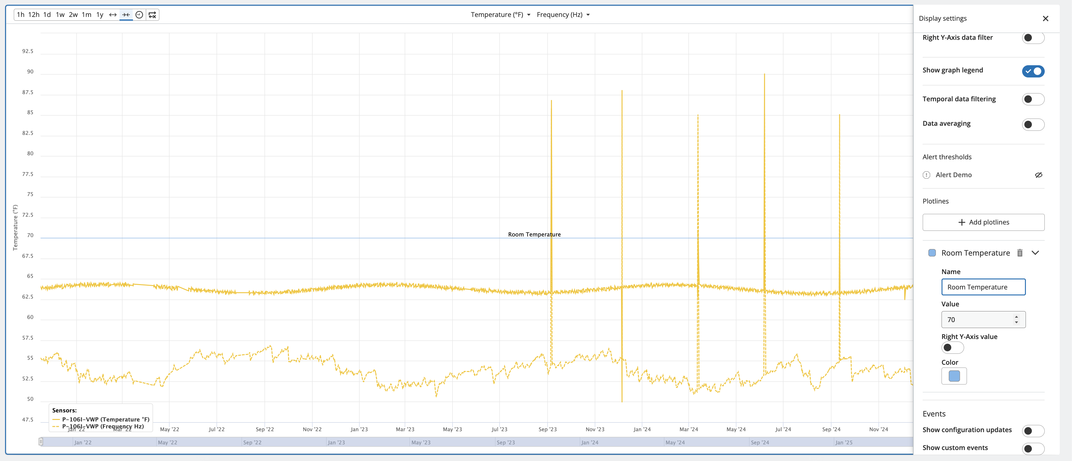 In the example below, we've configured a plotline for the left axis temperature metric, with a plotline name of "Room Temperature" and a blue line.