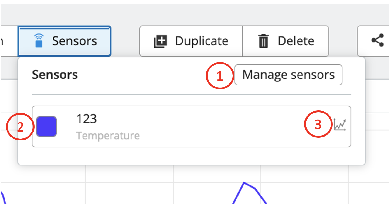 The "Sensors" button at the top of the graph profile has a few functions: adding additional sensors to the profile, changing graph line color for a sensor, and adding trendlines to a graph. To access these options, click the "Sensors" button to open a configuration window.
