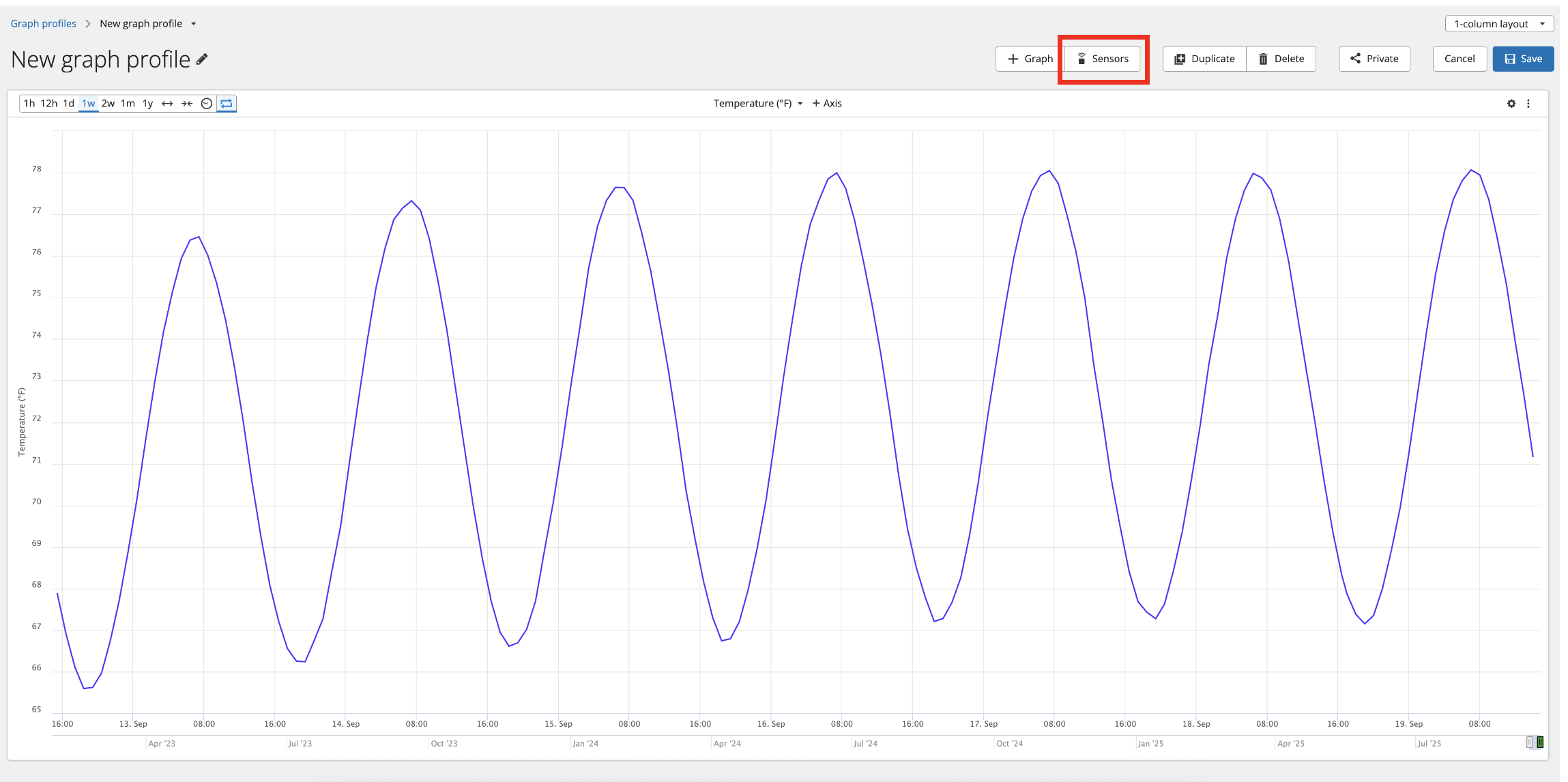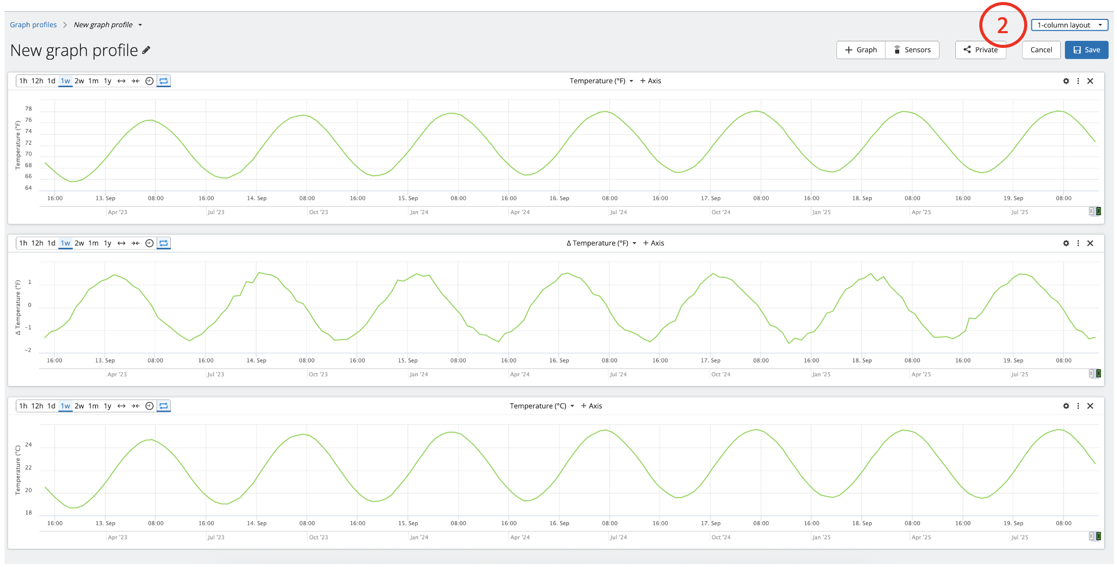 1. Adding additional Graph Panes- Click the "+Graph" button at the top of the profile page, highlighted by the red box below. You can add up to 6 graph panes to a single profile. The image below shows a graph profile with two graphs. This format is called a 2-column layout.