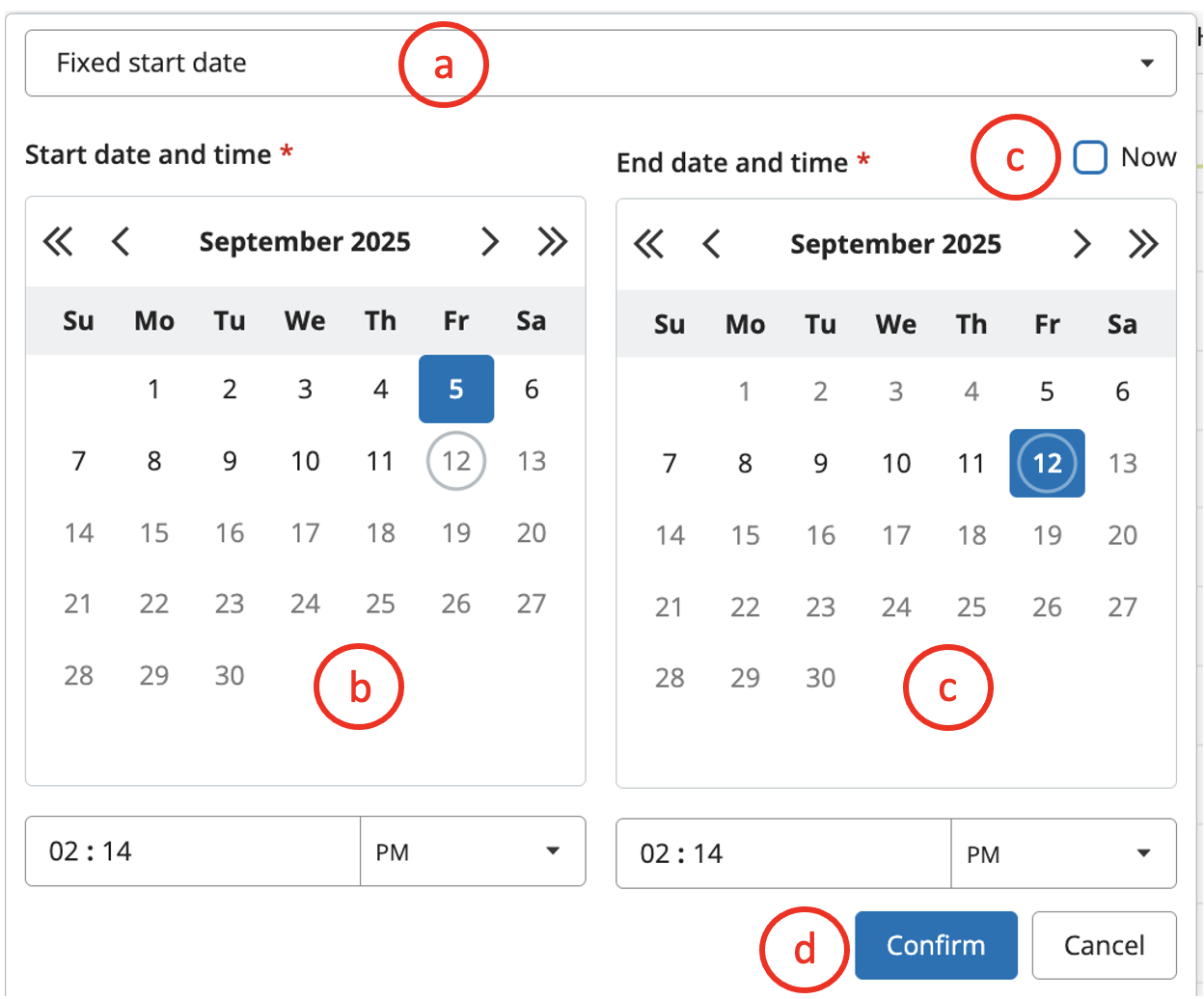 b.- The left calendar is the start date and time selector.