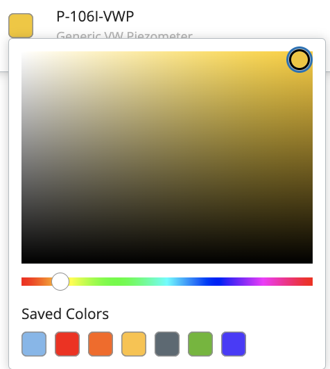 2. Changing Sensor Line Color- Clicking the colored box next to a sensor name opens a color configuration window, where you can select the graph line color for that sensor. From this window you can select a color from the color slider, customize the shade with the box, or select from a previously used "Saved Color" at the bottom of the window.