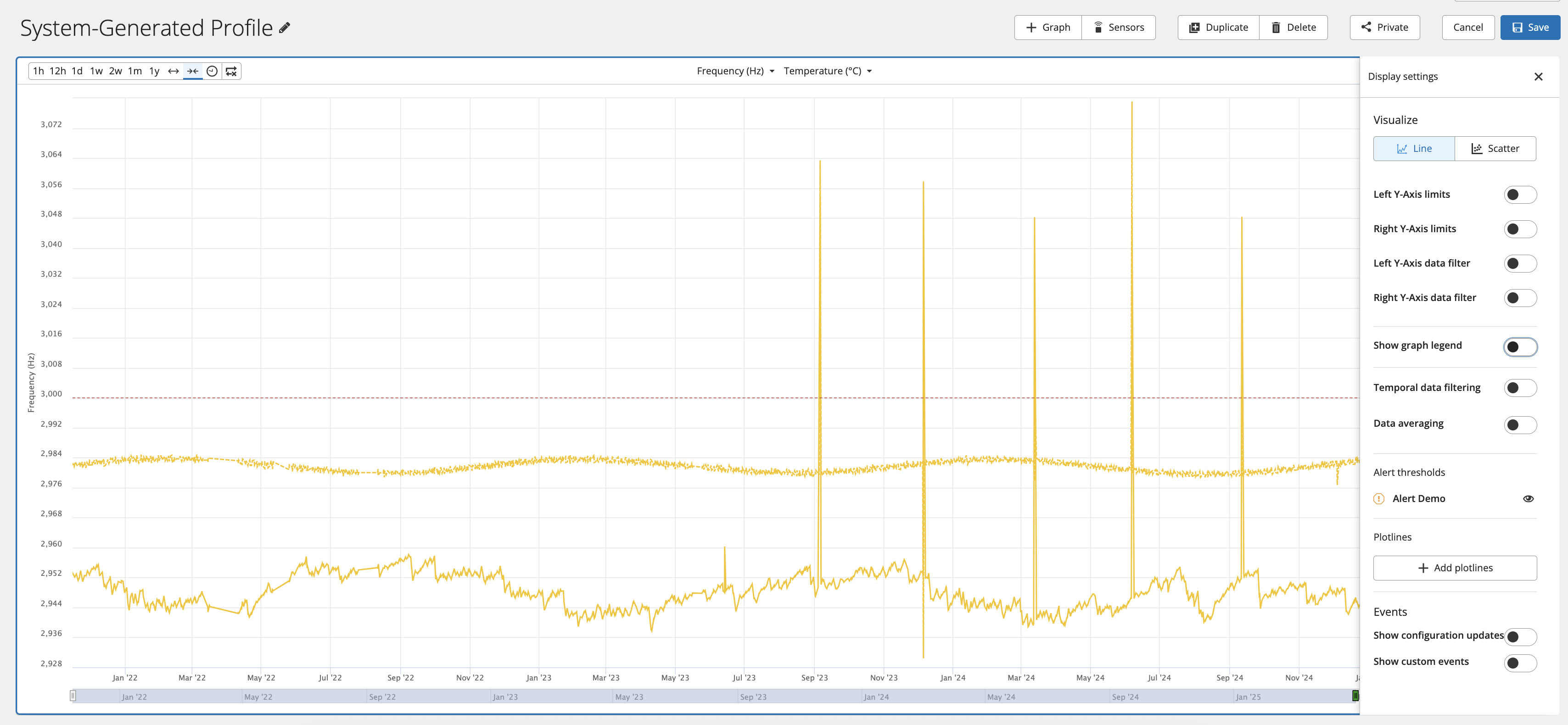 7. Alerts- Any alerts configured for the sensors and metrics configured on this graph will be available to toggle on and display on the graph, allowing you to visualize the graph data compared to alert thresholds. To toggle an alert on, click the "eye" icon to the right of the alert name. The example below shows the Alert Demo alert turned on, and the alert threshold can be seen on the graph as the red dotted line.
