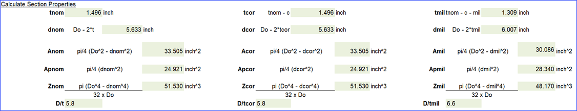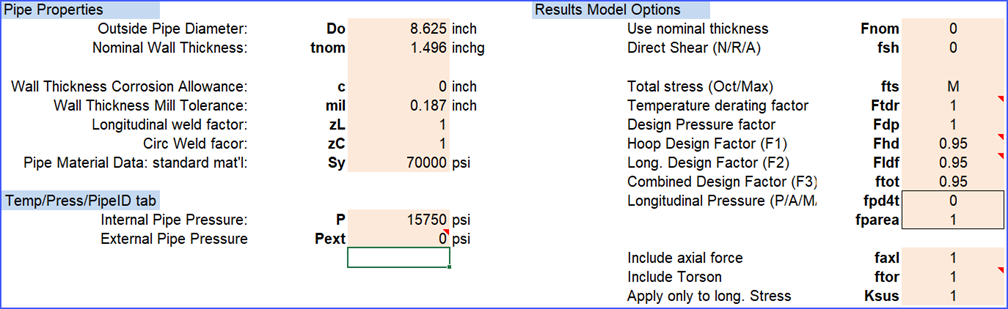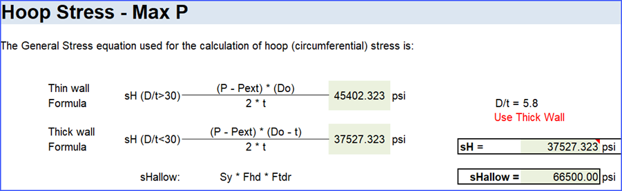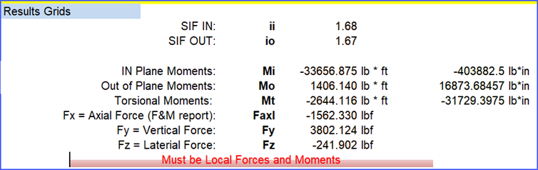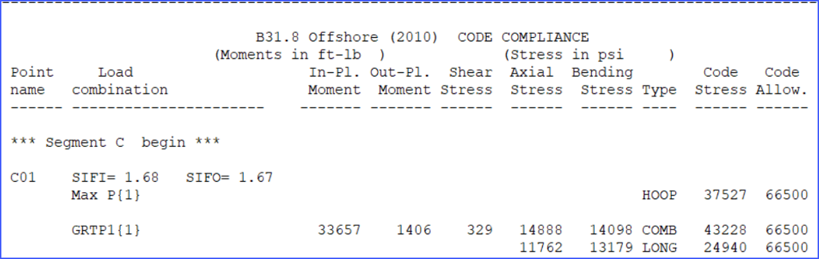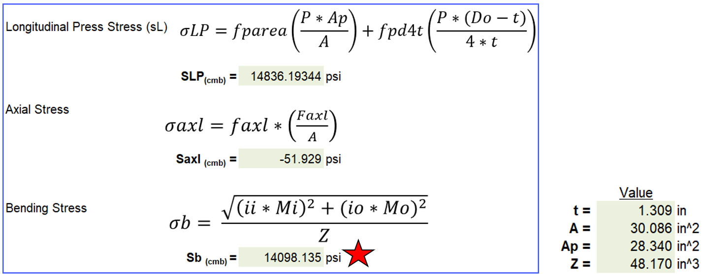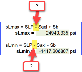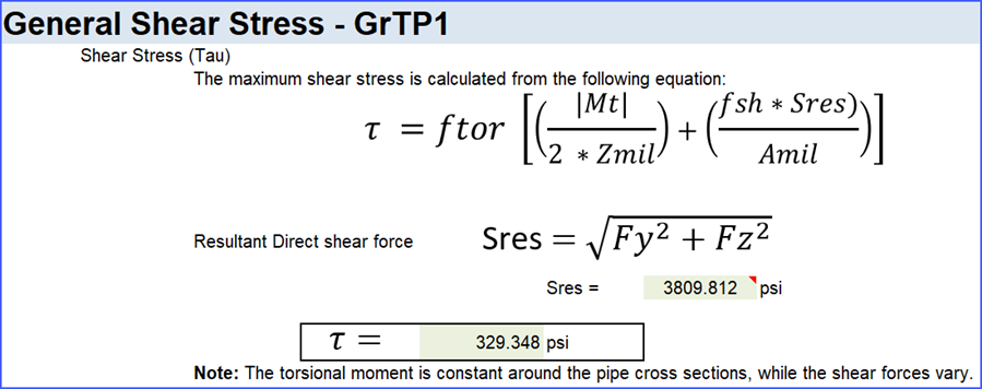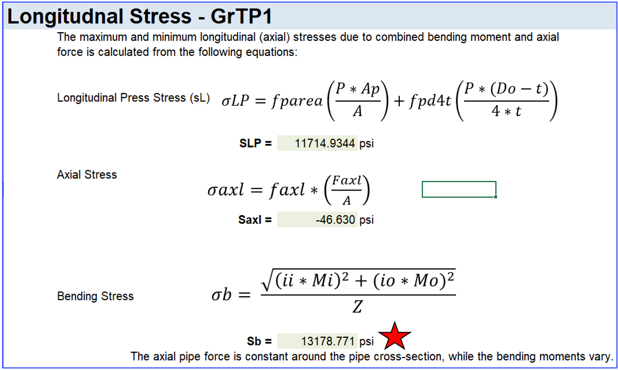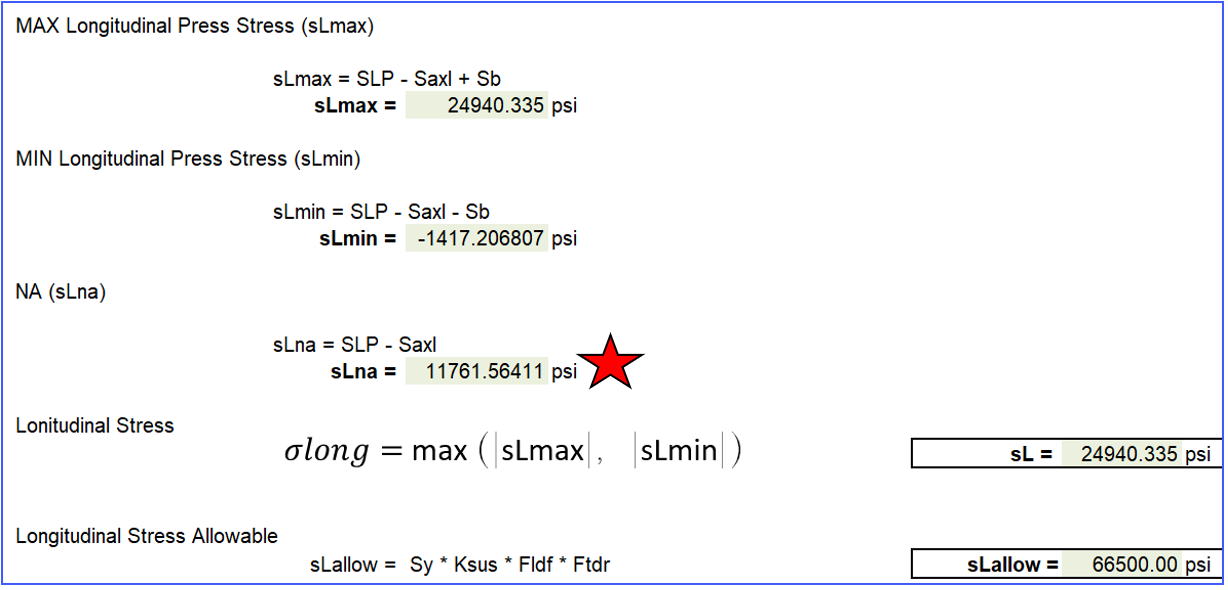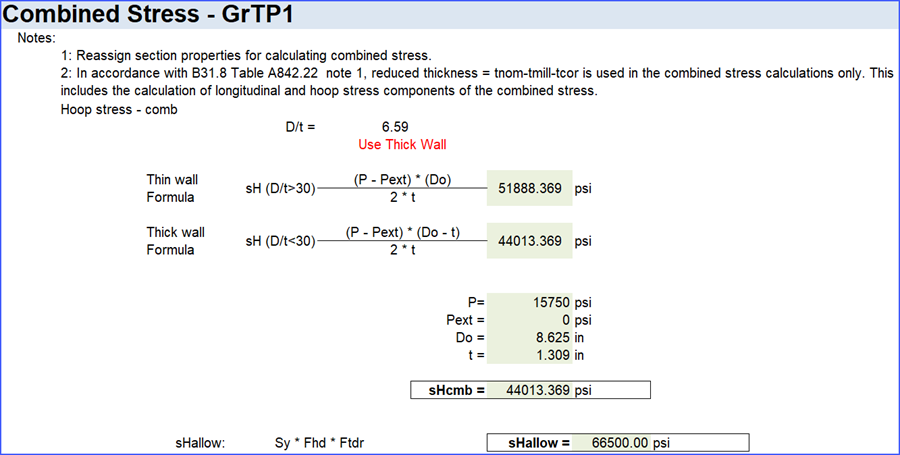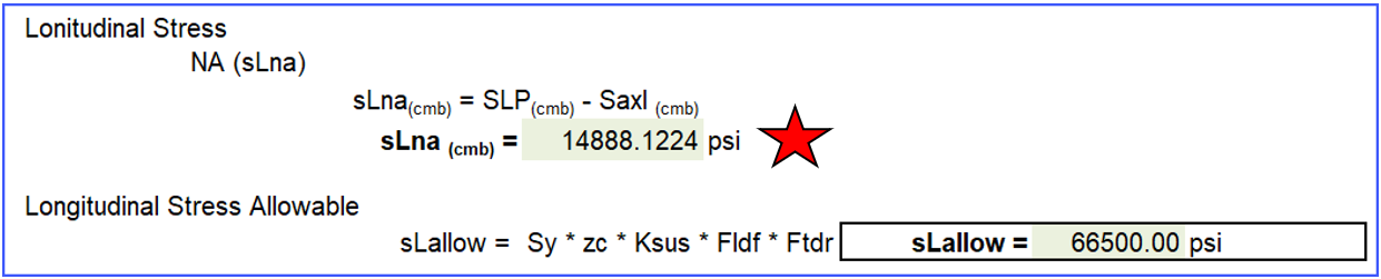 For some examples, notice that both the Hoop and Longitudinal Stress values used in the Combined Stress calculation were not the same values shown in the output report. Furthermore, recall how the reported Longitudinal Stress was determined as the maximum value between Slmin and Slmax. At the same time, the Combined Longitudinal Stress applied in the combined stress calculations was derived from Slna. Lastly, it is important to remember notes about calculating combined stress, use the Milll (reduced) section properties.