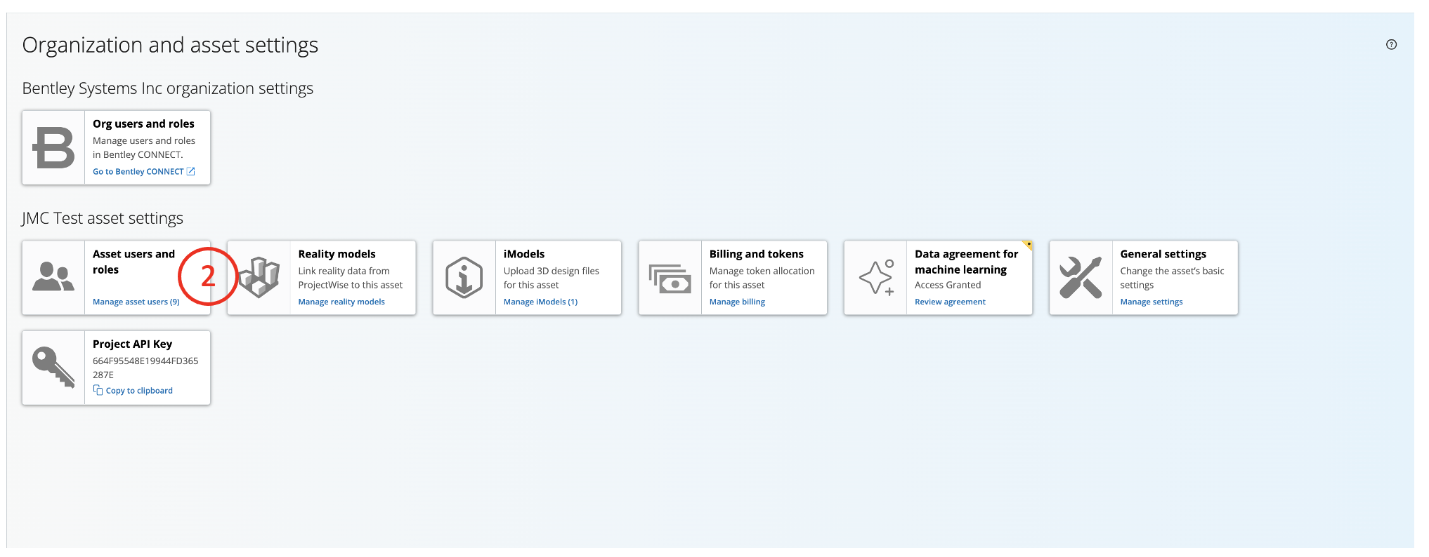 2. Navigating to Project Users- On the Organization and asset settings configuration page, there is a card called "Asset users and roles". Click the "Manage asset users" link on this card.