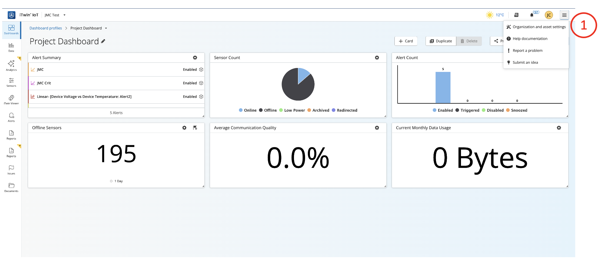 1. Organization and Asset Setting- Begin by navigating to the project you would like to allow external users to access. Click on the Menu bar in the upper right corner of the page to expose a dropdown selection. Click on the "Organization and asset settings" button in the dropdown.