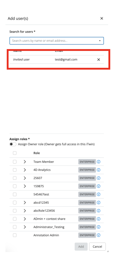 6. Add- Once your users and user role have been configured, clicking the "Add" button will send the selected users an invite to the project.