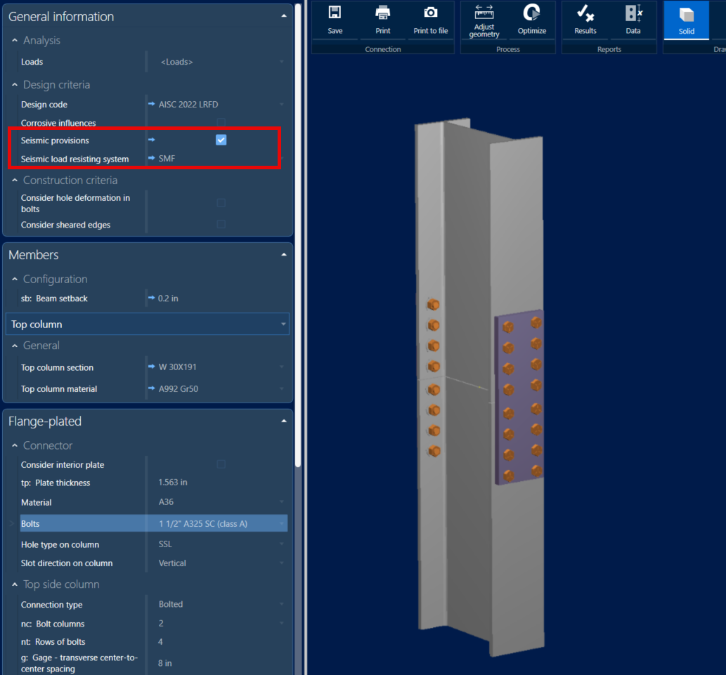 3. Column Splice Flange Plate Connection with AISC 341 Seismic Provisions. This release introduces enhanced Column Splice Flange Plate Connections that incorporate the seismic design provisions of AISC 341, expanding the program’s capabilities for designing lateral force-resisting systems in high seismic regions. The new implementation integrates the specific detailing and strength requirements defined in AISC 341, Chapter D2, ensuring that splice designs meet the stringent ductility and overstrength criteria necessary for seismic performance.