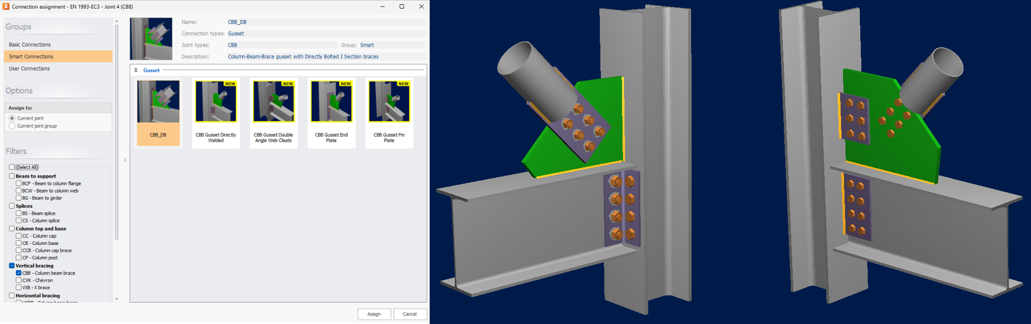 2. New Gusset-to-Beam and Gusset-to-Column Connections for EN 1993. The EN 1993 (Eurocode 3) connection library has been extended with new Gusset-to-Beam and Gusset-to-Column configurations for Column–Beam–Brace (CBB) gusset joints. In addition to the existing Bolted End Plate (BEP) connector, users can now choose among multiple connector types:
