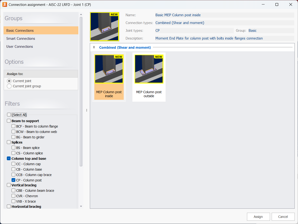 To improve usability, new assignment buttons have been added, allowing users to select and apply the different connector types similar to the workflows used in other design codes.