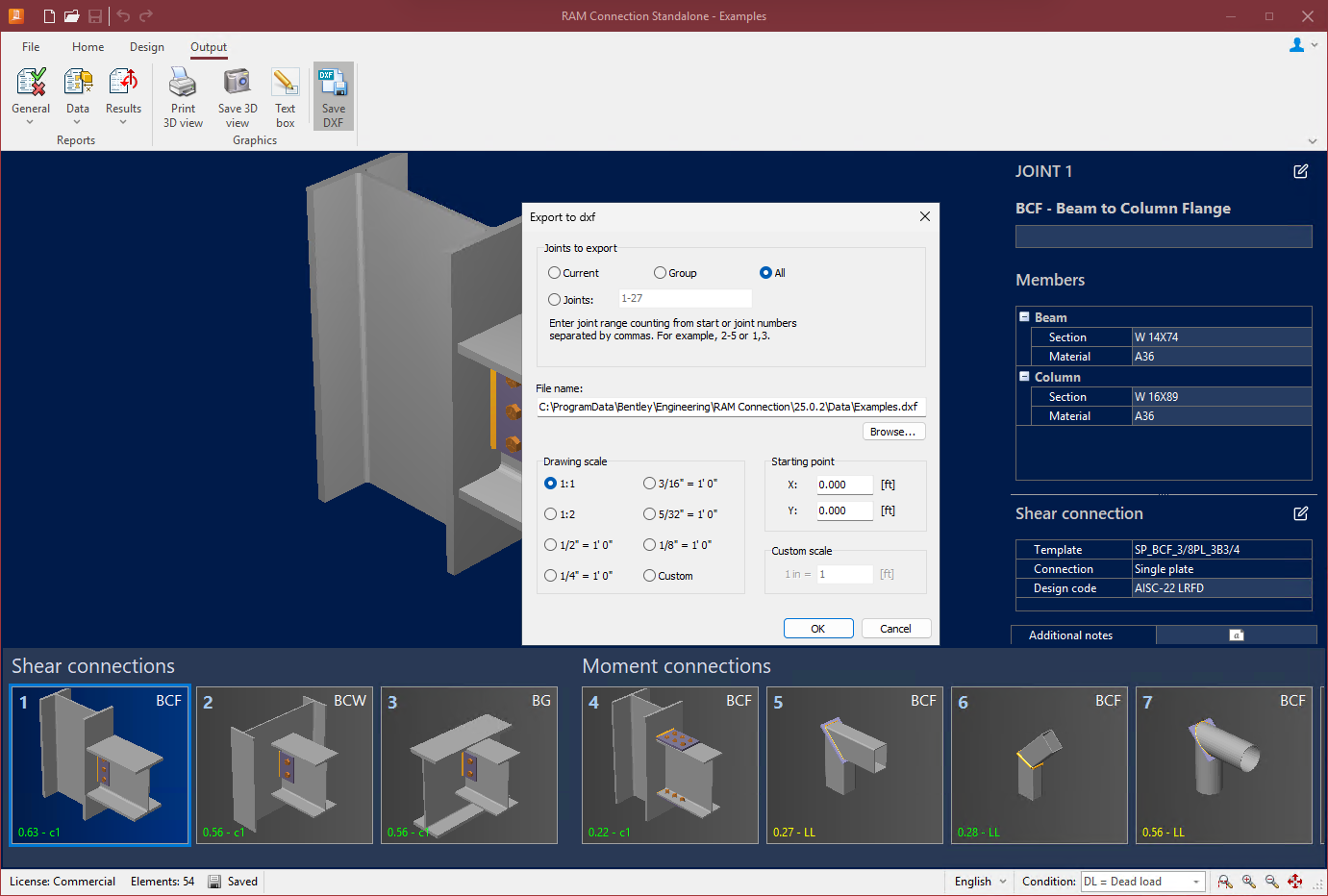 Figure 6. New options to export all connections from selected joints into a single DXF file.
