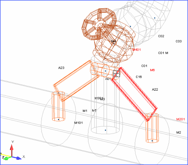 - Move to the new branch pipe node point (c) and insert a rigid beam to the surface of the pipe in both the +ve and -ve directions parallel to the header pipe.