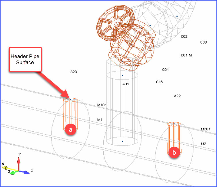 - Recall that AutoPIPE does not have a concept of pipe surface in the model UI. Therefore, the surface points need to be defined. Insert a rigid beam between the new header pipe node points (a and b) to the surface of the header pipe.